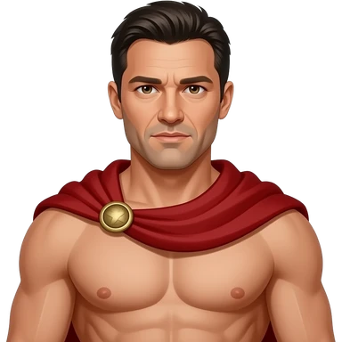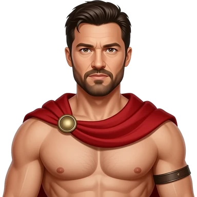The Spartan Leonidas. Muscly physique. Wearing a red cape. Masculin. Black hair. Brown Eyes. Gerard Butler emoji