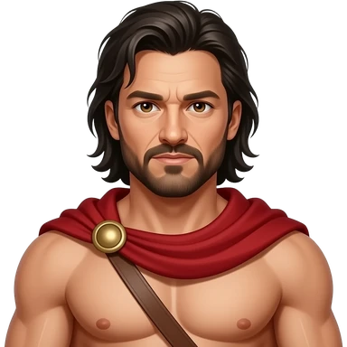 The Spartan Leonidas. Muscly physique. Wearing a red cape. Masculin. Black long hair. Brown Eyes. Beard. Gerard Butler emoji