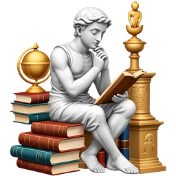 An icon featuring a thinker statue, a scroll, symbolizing philosophy. The design includes books and abstract symbols representing deep thought and wisdom. Transparent background highlights the study of ideas, logic, and existential questions emoji
