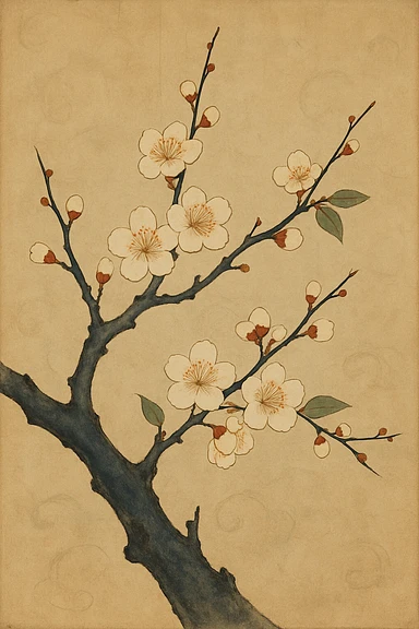 A blooming cherry blossom branch with delicate petals, nihonga style, elegant composition, traditional Japanese painting feel. emoji