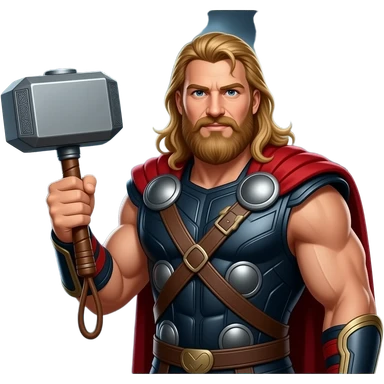 Thor from Norse Mythology with blue eyes, long blonde bearded wavy hair, deep blue armor, red cloak emoji