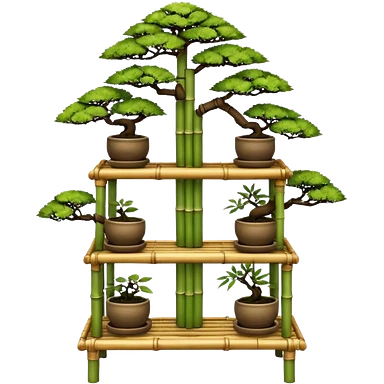 Three tiered bonsai planters stand, shelving holding nine specimens,frame made of one inch thick bamboo emoji