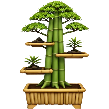 Three tiered bonsai planters stand, shelving holding six specimens,made of inch thick bamboo emoji