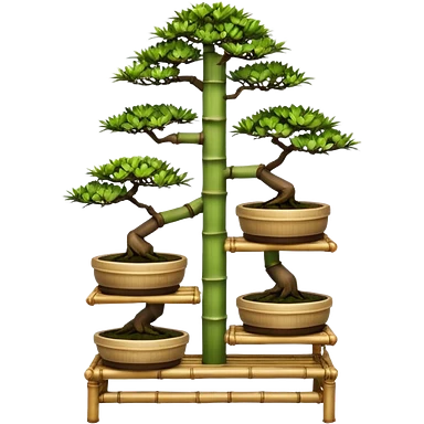 Three tiered bonsai planters stand, shelving holding six specimens,frame made of one inch thick bamboo emoji