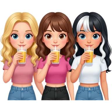 Three girls drinking. One blonde hair, one brunette hair, and one with black hair and white highlights in hair emoji