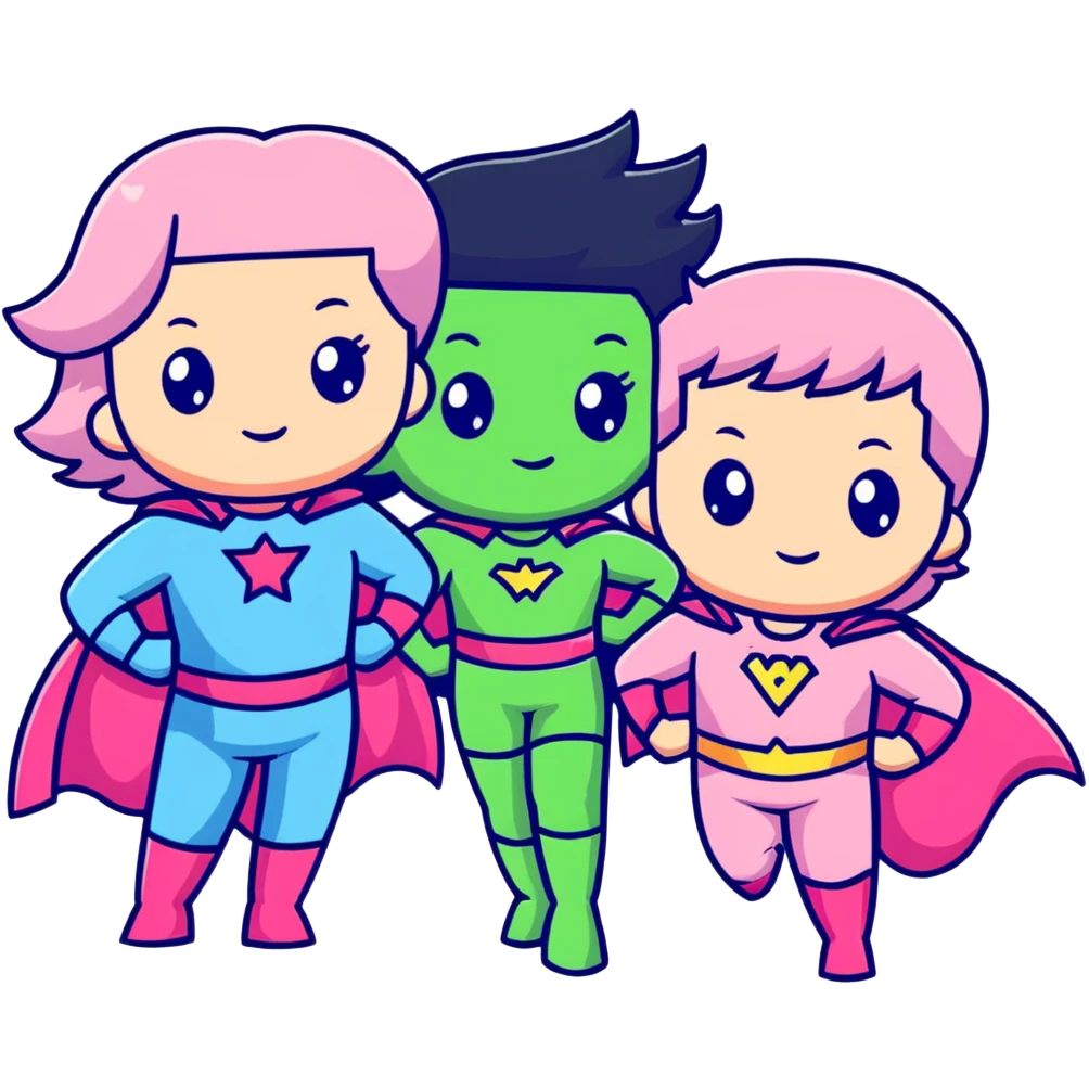 three cute superhero girls with powers - one in light blue costume, one in pink costume, and one in light green costume image | AI Emoji Generator