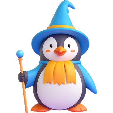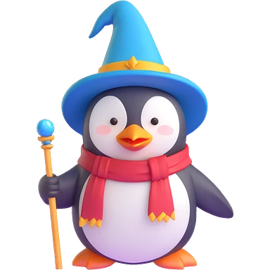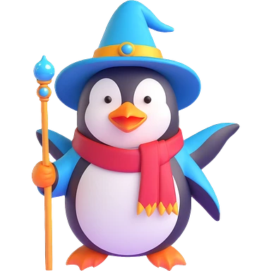A three-dimensional, vibrant penguin wizard with a pointy hat and a magic wand emoji