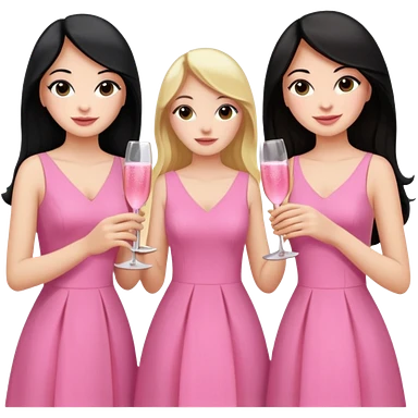 Three woman, one with black curly long hair and pink tight sparkly dress, the other with brown straight long hair and with pink tight sparkly dress and the last one with long blonde wavy hair and with pink tight sparkly dress celebrating with pink champagneemoji