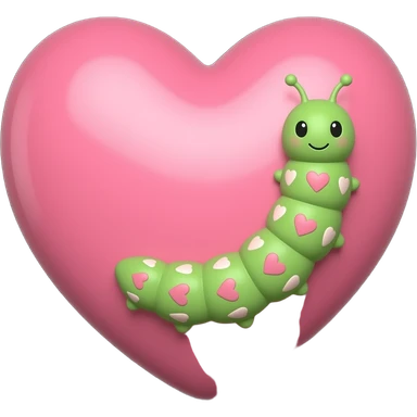 Black background Smaller Adorable green itty bitty tiny little catipillar with tiny hearts on each body sectioncrawling up the side of a big muted pink colored heart emoji