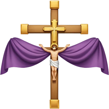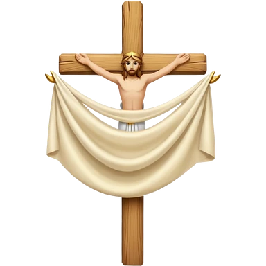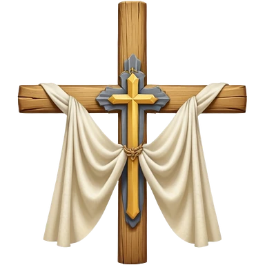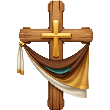 Cross made of wood, the top of the tip of the cross, a golden cross, and a white cloth hanging over the two arms of the cross emoji