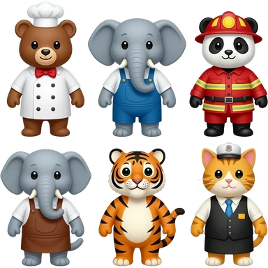 Baker bear, mechanic elephant, firefighter panda, librarian elephant, artist tiger, and waiter cat emoji