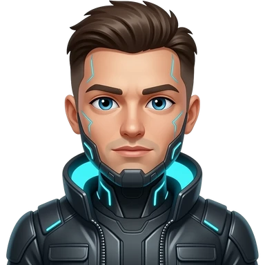 A cyberpunk emoji with a glowing neon blue smile, pixelated cybernetic eyes, and a sleek metallic surface, futuristic and high-tech style. emoji