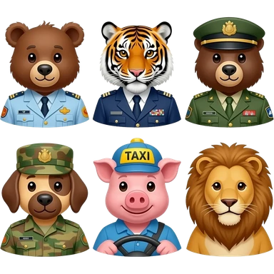 Electrician bear, train conductor tiger, train driver bear, soldier dog, taxi driver pig, and actor lion emoji