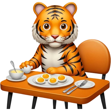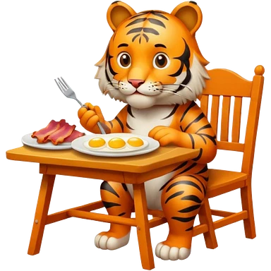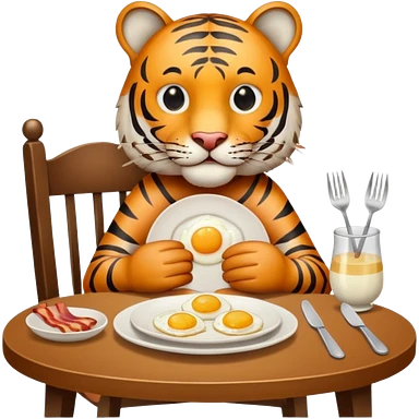 Tiger sitting by a table on a chair with a plate of eggs and bacon in front of him on the table place setting emoji