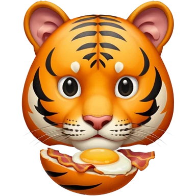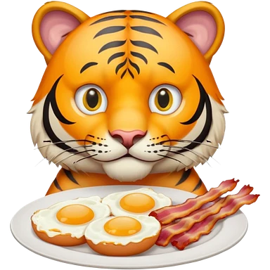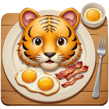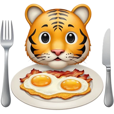 Tiger with plate of 2 eggs and bacon in front of him at a table emoji