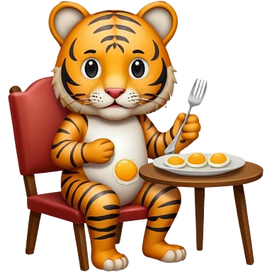 Tiger sitting by a table on a chair with a plate of eggs and bacon in front of him on the table emoji
