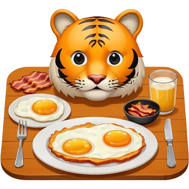 Tiger sitting by a table with a plate of 2 eggs and bacon in front of him on the table place setting emoji