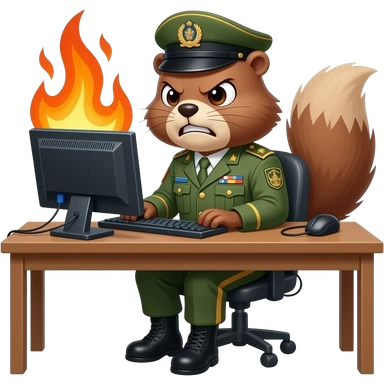 Marmotte enragé avec feu en tenu militaire travaillant devant ordinateur emoji