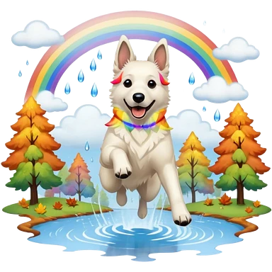 White belgian Shepard jumping over Rain puddles. There is a rainbow in the sky emoji