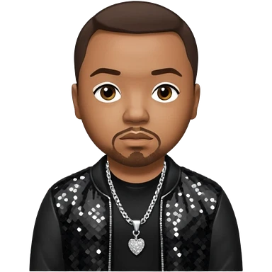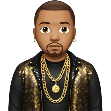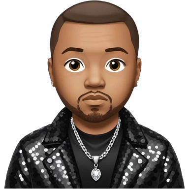 Timbaland with dark brown hair, black sequin jacket, black shirt with necklace emoji