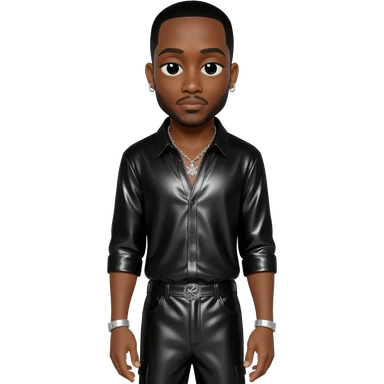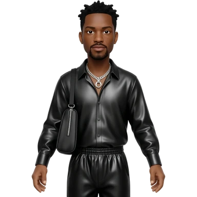 Timbaland with black hair, black metallic shirt, black metallic baggy pants, silver necklace emoji