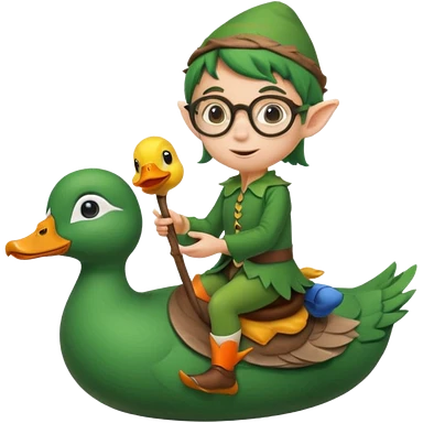 tiny forest elf blode hair with round glasses riding a wild duck emoji