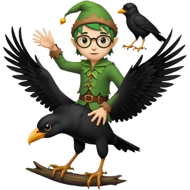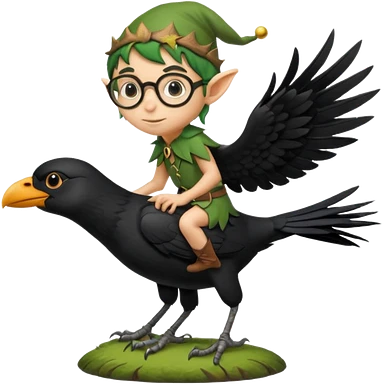 tiny forest elf with round glasses riding crow emoji