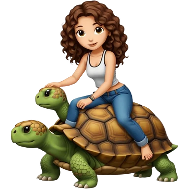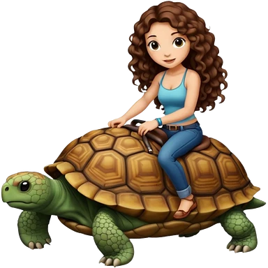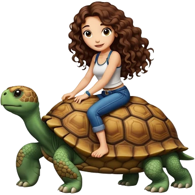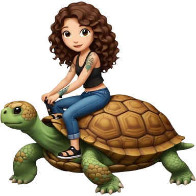 ccute woman long curly brown hair tattoos riding big tortoise emoji