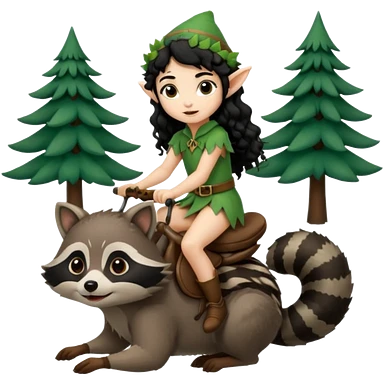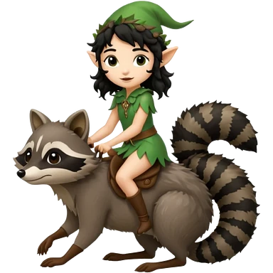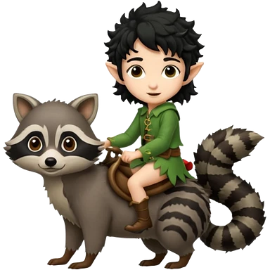 tiny forest elf with curly black hair riding raccoon emoji