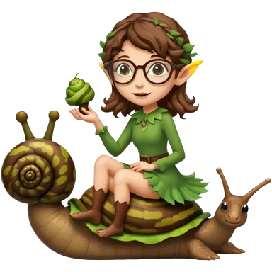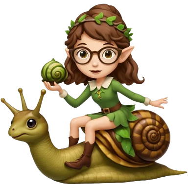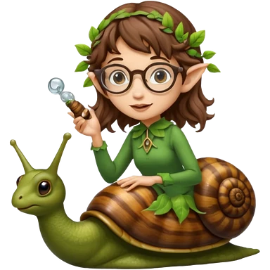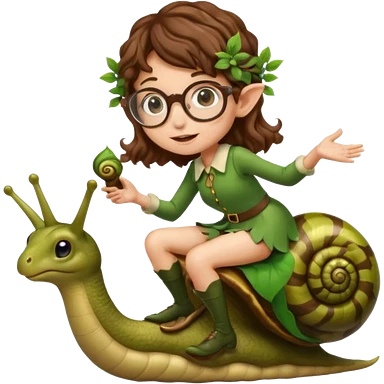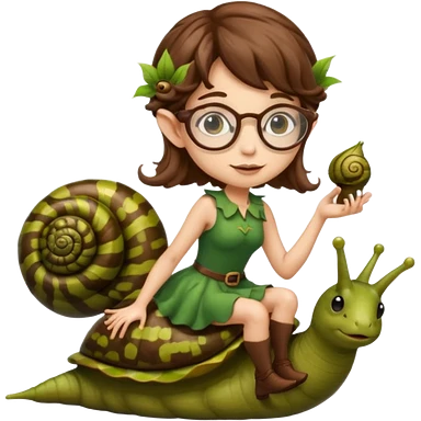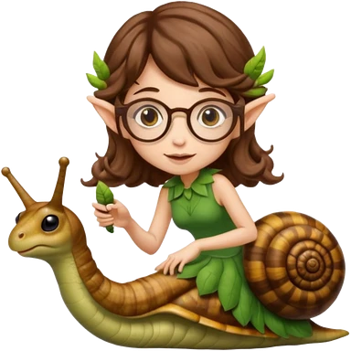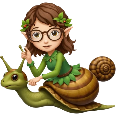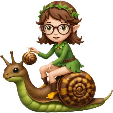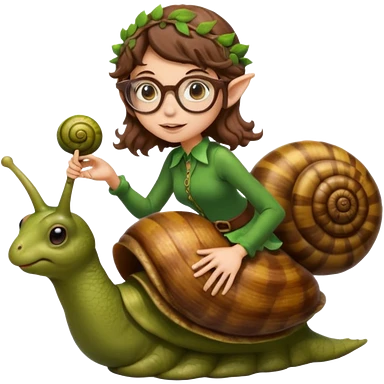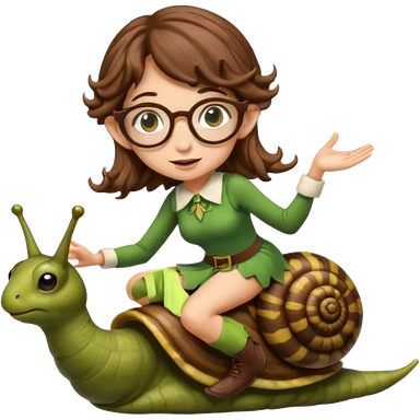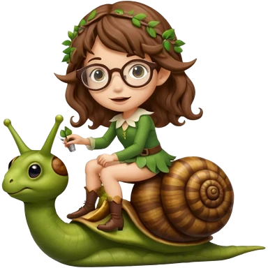 tiny forest elf woman brown wavy hair glasses riding a snail emoji