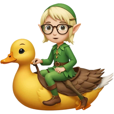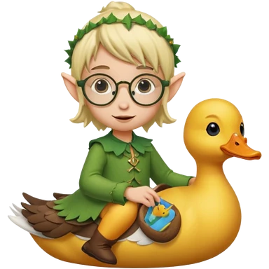 tiny forest elf blode hair with round glasses riding a wild duck emoji