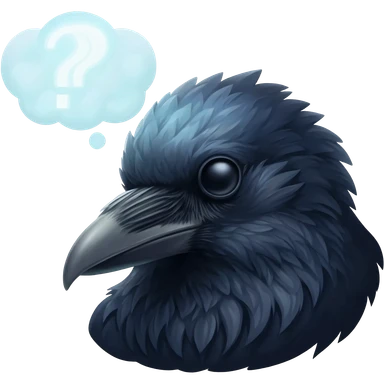 A close-up of the raven's head, beak resting thoughtfully on its wing "chin," with a detailed "thinking cloud" containing a subtle glowing question mark emoji