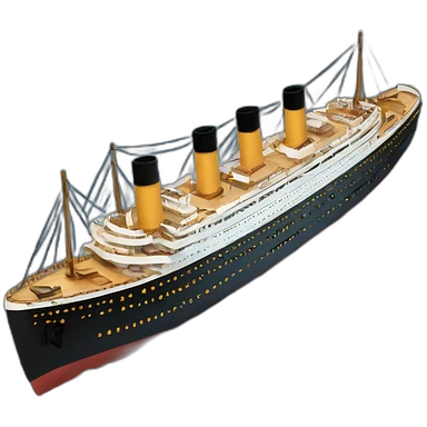 compact 3D Titanic ship emoji in Apple style, smooth and shiny, with bright colors, simplified but clear Titanic details, floating on water, no faces, soft shadows, high-quality render, white background emoji