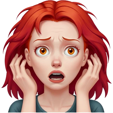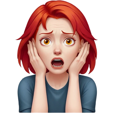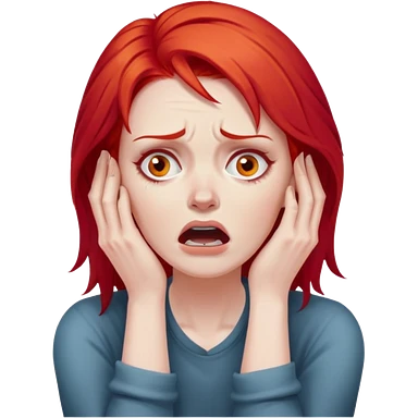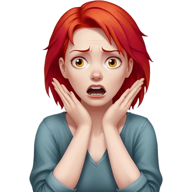 of a white woman with bright red hair, visibly distressed and clutching her neck with both hands, her face conveying a strong sense of panic and fear emoji