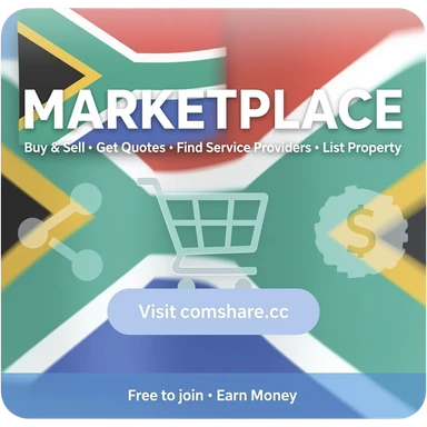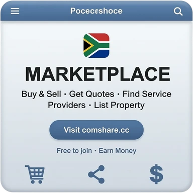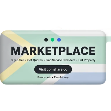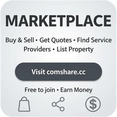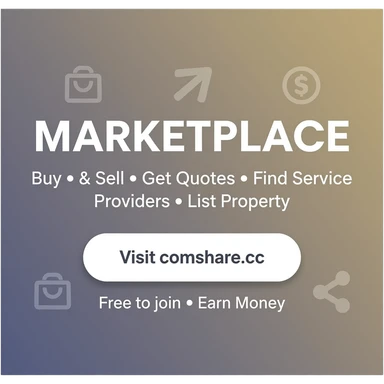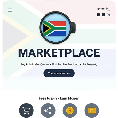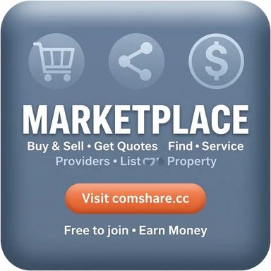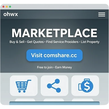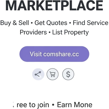Title: ComShare Main heading: "MARKETPLACE" Subtext: "Buy & Sell • Get Quotes • Find Service Providers • List Property" Call to action: "Visit comshare.cc" Bottom text: "Free to join • Earn Money". Include subtle icons for shopping, sharing, money. Modern look. emoji | AI Emoji Generator