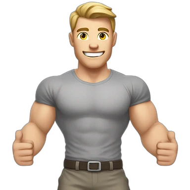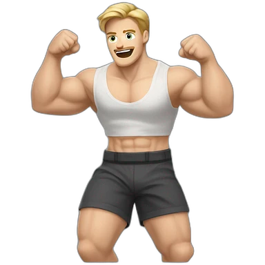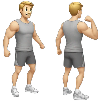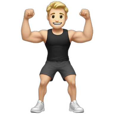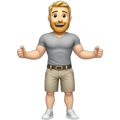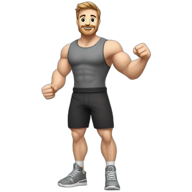 To knee Actively gesturing with hands Pale skinned Fit Man With the biceps and light brown hair in dark gray Sleeveless Mike, black oversize sports shorts and white Sneakers emoji | AI Emoji Generator