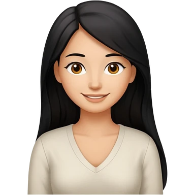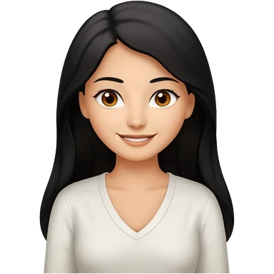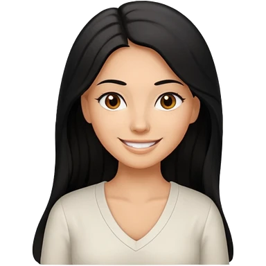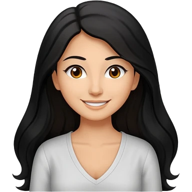 medium tan woman with long black hair past middle of back, round brwn eyes, white v neck blouse smiling. emoji