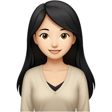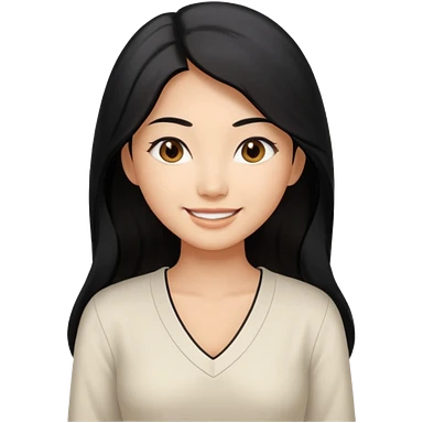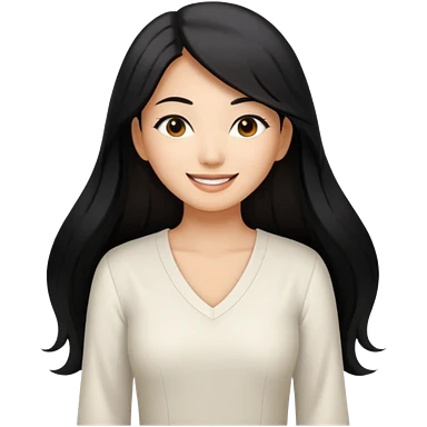 medium tan asian woman with long black hair past middle of back, round brwn eyes, white v neck blouse smiling. emoji