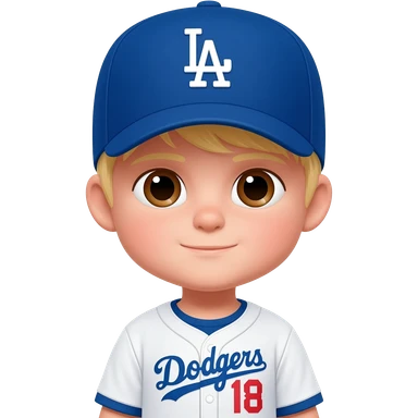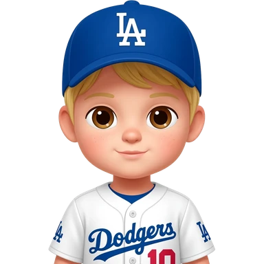 toddler in a dodgers uniform with baseball cap whiter blonde hair brown eyes emoji