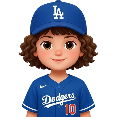 toddler girl in a dodgers uniform with baseball cap curly brown short hair and dark brown eyes emoji