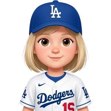 toddler girl in a white dodgers uniform with baseball cap with light brown pigtails and blue eyes emoji | AI Emoji Generator
