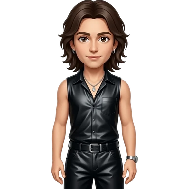Tom Kaulitz with brown eyes, long dark brown hair, black metallic sleeveless shirt, black metallic baggy pants, silver necklace and earrings emoji