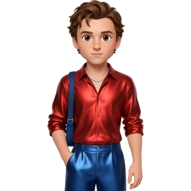 Tom Holland with brown eyes, brown hair, red metallic shirt, indigo metallic baggy pants, silver necklace emoji