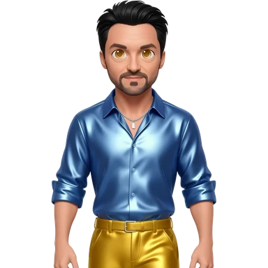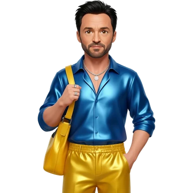 Hugh Jackman with hazel eyes, black hair, periwinkle blue metallic shirt, yellow metallic baggy pants, silver necklace emoji