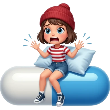 Tomgirl with short hair and beanie is shaking violently (indicated by squiggly lines). She is sitting on a giant Adderall pill that is kind of a pillow. She had one black eye and looks shocked. emoji | AI Emoji Generator
