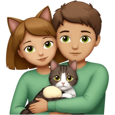 Crea un emoji donde salga un chico moreno con los ojos claros, una chica morena con los ojos marrones y un gato europeo comun de pelaje oscuro y ojos verde claro, quiero que se esten abrazando y el gato este en el medio de los dos emoji