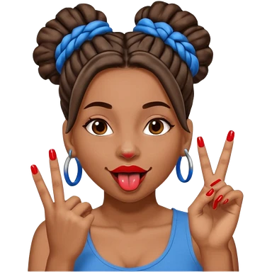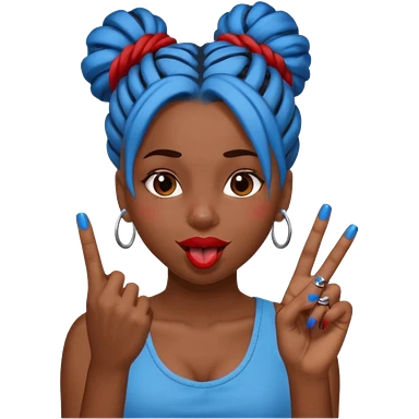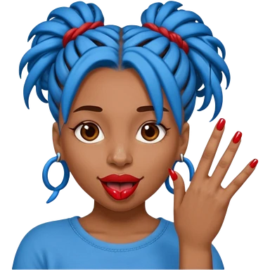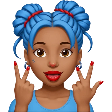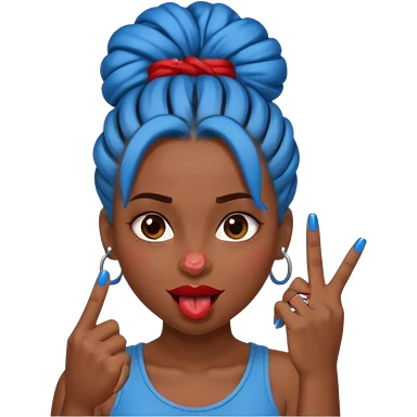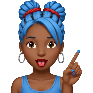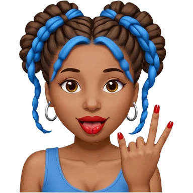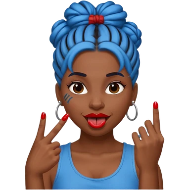 brown girl with blue locs in a bun with tongue out and red nails showing secomdnd finger emoji