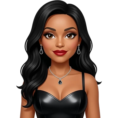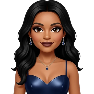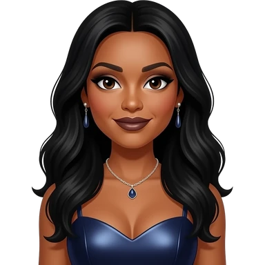 Trina Braxton from The Braxtons with dark brown eyes, long black hair, black eyeshadow, dark brown lipstick, dark indigo metallic sweetheart dress, necklace and earrings emoji