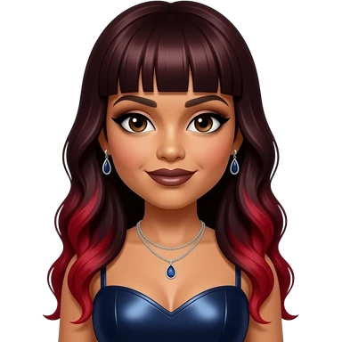 Traci Braxton from The Braxtons with dark brown eyes, long dark red bang hair with red ombre, black eyeshadow, dark brown lipstick, dark indigo metallic sweetheart dress, necklace and earrings emoji