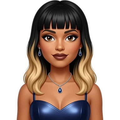 Towanda Braxton from The Braxtons with dark brown eyes, long black bang hair with blonde ombre, black eyeshadow, dark brown lipstick, dark indigo metallic sweetheart dress, necklace and earrings emoji